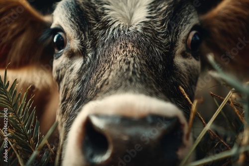 Detailed, Close-Up Portrait of Holstein Calf Face with Fur Texture, Large Eyes, and a Blurry Snout in Field