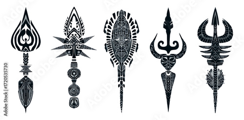Detailed Collection of Isolated Tribal Art Spear Designs on Transparent Background