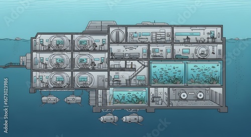 Detailed Cross-Section of Underwater Research Station with Aquariums and Living Quarters.