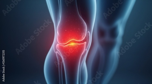 Detailed depiction of a human knee joint in glowing blue tones, with red and orange highlights symbolizing pain or injury, set against a dark blue gradient.