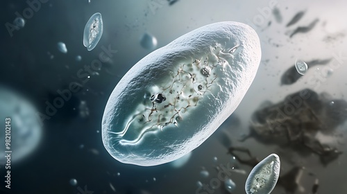 Detailed depiction of a singlecelled paramecium swimming among debris in a microscopic world