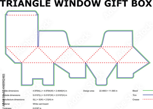 Detailed diagram of a triangle window gift box with dimensions and measurements