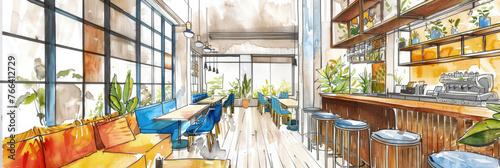 Detailed drawing of empty restaurant interior with long counter extending across room, depicting various seats and bustling atmosphere