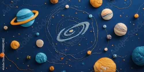 Detailed embroidery of stars and planets in space, using colorful threads, beads and French knots.