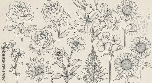 Detailed floral sketch collection Roses, lilies, sunflowers, and other botanical line art designs