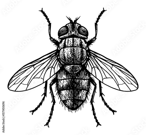 Detailed Fly Insect Top View Black and White Outline Line Art Drawing Vintage Engraving Style