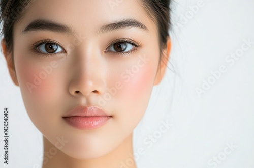 Detailed front-view close-up of a young Asian model, clean and glowing skin