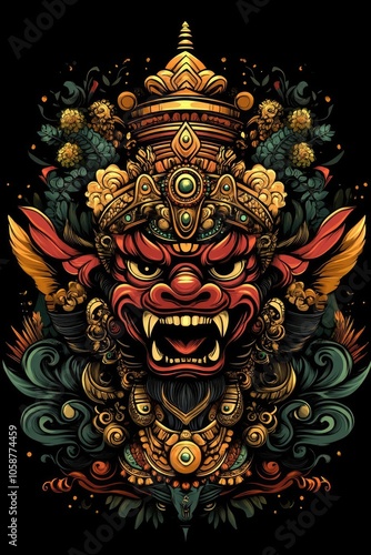 Detailed Full-Color Illustration of Balinese Demon Mask for T-Shirt Print, No Background, Vibrant Colors
