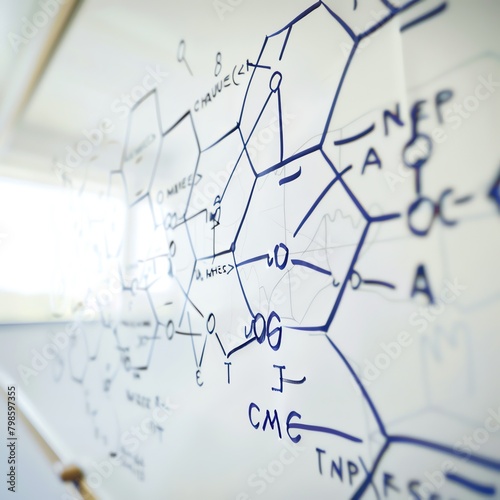 Detailed graphic of a chemical formula and its corresponding molecular structure diagram on a whiteboard, ideal for academic presentations