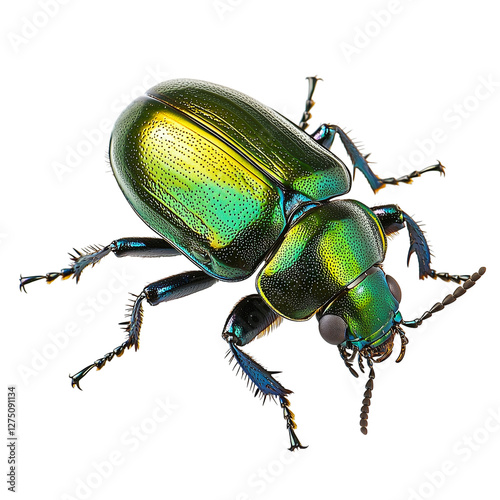 Detailed green June beetle insect with glossy exoskeleton and delicate legs, macro shot, isolated on transparent or white background, png