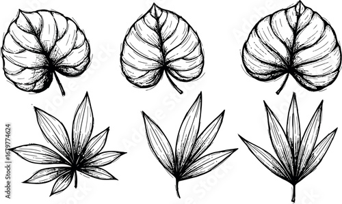 Detailed hand drawn black and white leaves vector illustration set natural elements collection