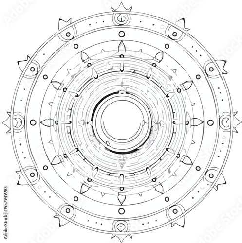 Detailed hand drawn circular geometric design with intricate patterns and decorative elements.