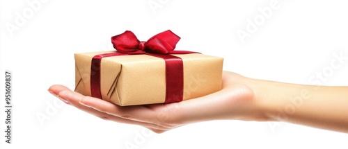 Detailed hand offering a gift box isolated on bright white background intricate details soft shadows professional quality