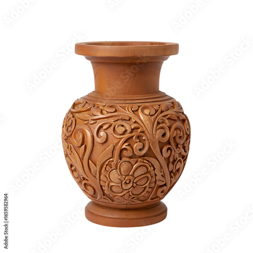 Detailed Hand-Carved Wooden Vase with Elegant Floral and Leaf Scrollwork Patterns