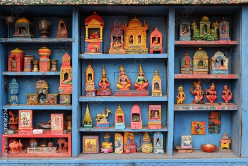 Detailed handcrafted figurines and idols are arranged on bright blue wooden shelves. The vibrant colors and intricate designs showcase local artistry, creating a lively atmosphere.