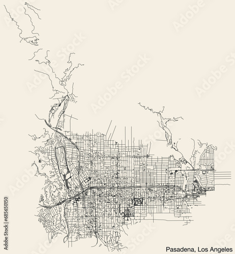 Detailed hand-drawn navigational urban street roads map of the CITY OF PASADENA of the American LOS ANGELES CITY COUNCIL, UNITED STATES with vivid road lines and name tag on solid background