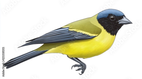 Detailed Illustration of a Colorful Bird with Yellow and Black Feathers Perched on a Branch