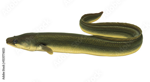 Detailed Illustration of a European Eel with Olive Green Scales and Yellow Underside