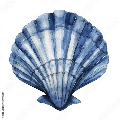 Detailed illustration of a vibrant blue-and-white seashell. The shell's intricate, ribbed structure is meticulously depicted, showcasing a range of blues, from deep to light, with white highlights
