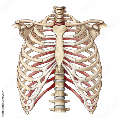 Detailed illustration of human rib isolated on white background, showing bone anatomy and structure for medical