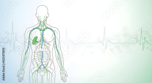 Detailed illustration of the human lymphatic system, showing lymph nodes and vessels throughout the body, with a subtle heartbeat graphic in the background, representing health and wellness.