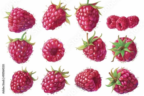 Detailed illustration set of ripe raspberries displayed in various angles and textures