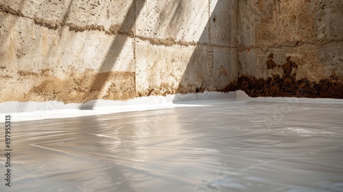 Detailed image of a construction site, foundation coated with epoxy resin, showing strong, resilient structure, seamless coverage, professional application
