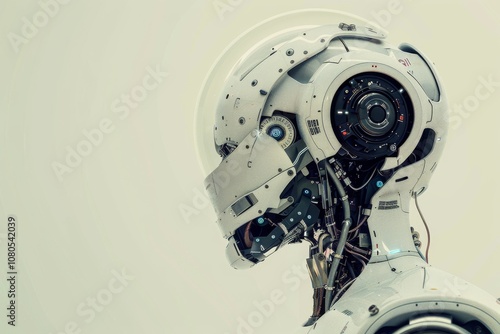 Detailed image of a futuristic robot head showcasing advanced technology and intricate mechanical design.