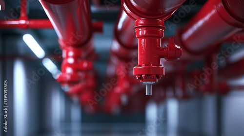 Detailed image of a red pipe network feeding into multiple fire sprinkler heads in a commercial ceiling. A behind-the-scenes look at fire suppression infrastructure.