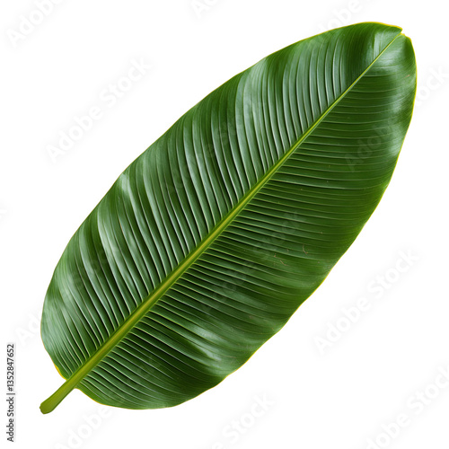 Detailed image of a vibrant, green tropical leaf with a prominent central vein and symmetrical, parallel ridges extending to the edges,