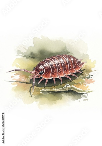 Detailed Isopod Illustration - Close-up illustration of a reddish-brown isopod on a green and brown background. High-resolution ideal for educational or scientific purposes