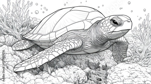 Detailed line art drawing of a sea turtle resting on a coral reef.