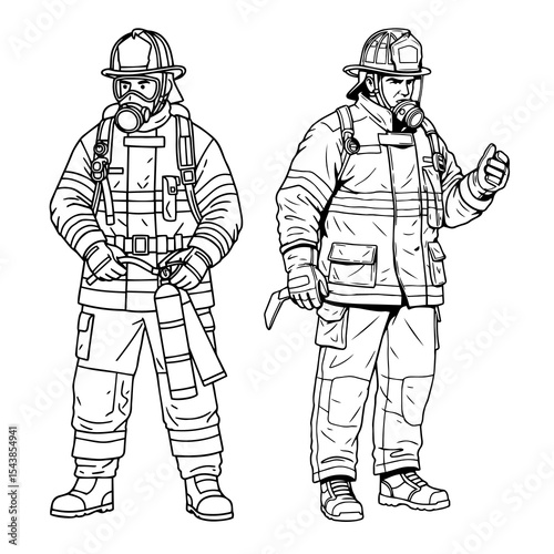 Detailed Line Art Illustrations of Two Firefighters in Full Protective Gear