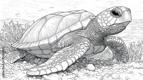 Detailed line drawing of a sea turtle on a sandy ocean floor.