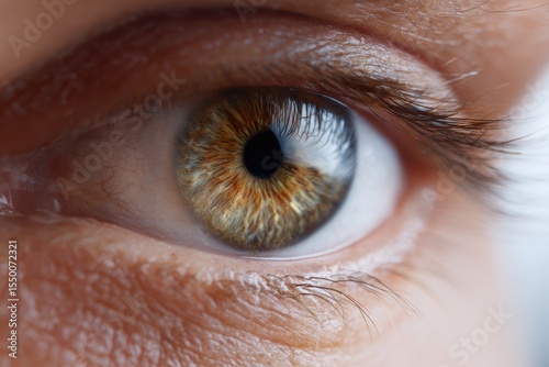 Detailed macro image of an eye with natural iris colors and eyelashes