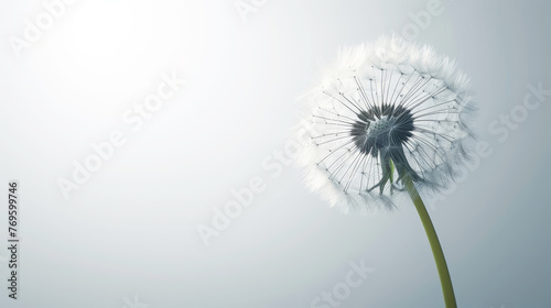 Detailed macro shot of single dandelion with seeds on white background with sun rays. Aesthetic concept. Generative AI