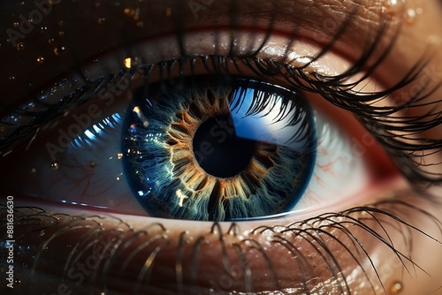 Detailed macro view of a human eye in vibrant blue and green colors, close up shot