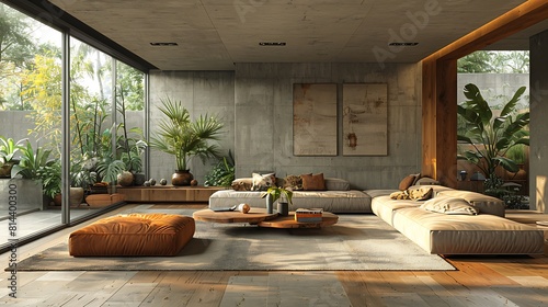 Detailed modern rustic living room showcasing an elegant use of space with a mix of raw wooden elements and sleek, contemporary fixtures, rendered hyperrealistically with a focus on texture contrasts