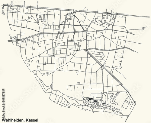 Detailed navigation black lines urban street roads map of the WEHLHEIDEN DISTRICT of the German regional capital city of Kassel, Germany on vintage beige background