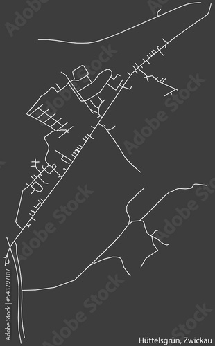 Detailed negative navigation white lines urban street roads map of the HÜTTELSGRÜN DISTRICT of the German regional capital city of Zwickau, Germany on dark gray background