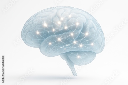 Detailed neural network brain visualization with glowing synapses and fiber connections on clean white modern science concept cognition ai interface