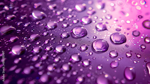 Detailed patterns and reflections are highlighted in this macro photo of water droplets on a vivid purple surface, making it ideal for abstract backdrops.