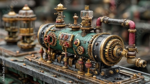 Detailed photograph of intricate steampunk machinery with brass gears, valves, and pipes, evoking retro-futuristic technology and fantasy design.