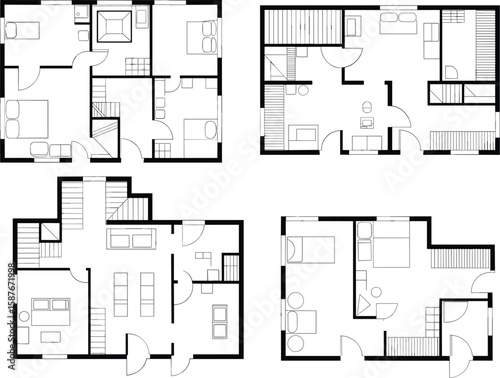 Detailed residential house floor plan with bedrooms, living areas, bathrooms, staircases, and furniture layout in clean black line blueprint