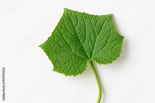 Detailed shot of a single green cucumber leaf on its stem against a white backdrop