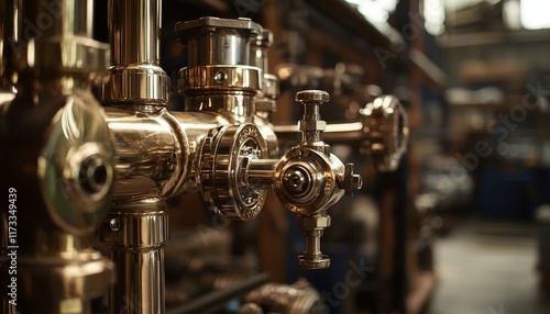detailed shot of bronze pipes and fittings arranged in a complex network within an industrial environment, emphasizing the functionality and aesthetics of the materials