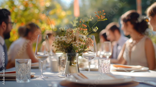 Detailed Shot of Wedding Invitation on Decorated Table with Blurred People in Background