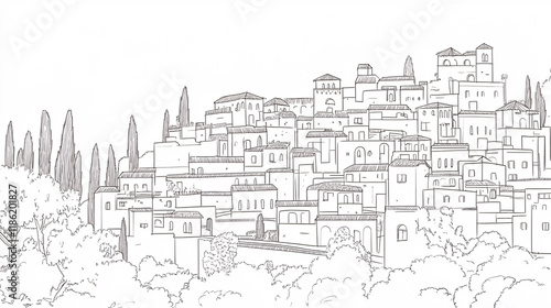 detailed sketch of a mediterranean hill town with clustered buildings and trees creating a serene and classic illustration