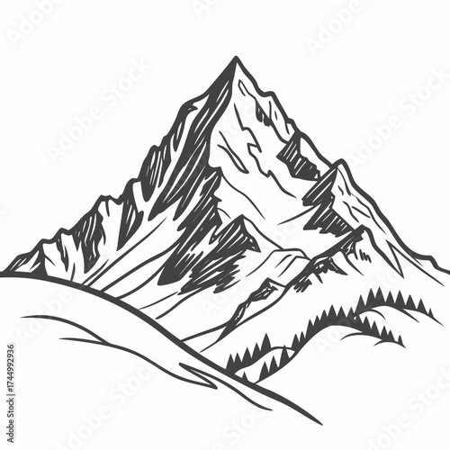 Detailed sketch of a snowcapped mountain range with rugged peaks and a dense forest at its base, rendered in a monochrome style, evoking a sense of wilderness and natural beauty