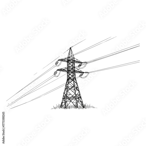 Detailed sketch of an electric power line tower with multiple high voltage transmission cables, energy infrastructure
